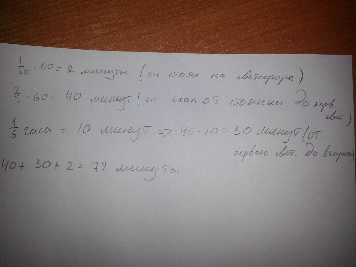 От стоянки до первого светофора автомобиль ехал 2/3 часа, а до второго светофора - на 16 часа меньше. Сколько времени затратил автомобиль на движение от стоянки до второго светофора, если на первом светофоре он стоял 1/30 часа?