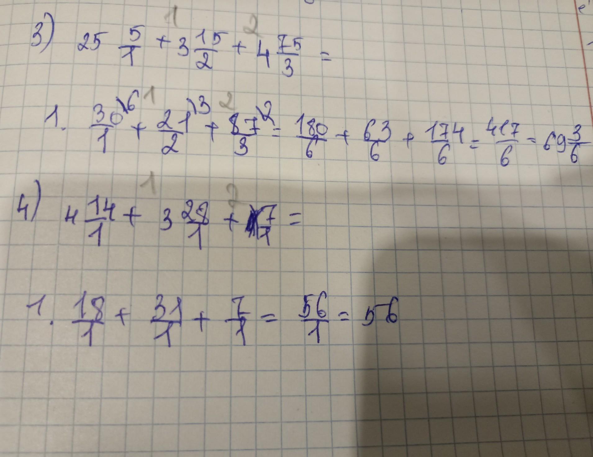 _Математика Д/З_ 1)32 1/3 + 4 1/4 + 3 3/12 2)14 4/7 + 13 + 8/8 + 3 + 1/56 3)25 1/5 + 3 2/15 + 4 3/75 4)4 1/14 + 3 1/28 + 1/7 /-Дробная черта даю 20 балов