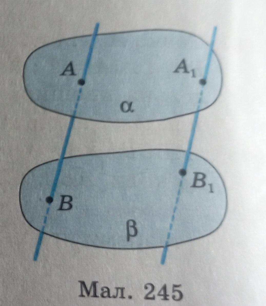 Чи паралельні прямі АВ і А1В1, якщо паралельні площини а і в перетинають їх у точках А, В, А1, В1, як показано на малюнку 245?