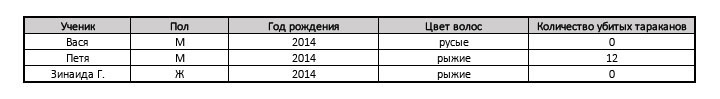 Таблица "объекты – свойства" содержит значения свойств однотипных объектов. Например, такую таблицу можно составить по ученикам какого-нибудь класса