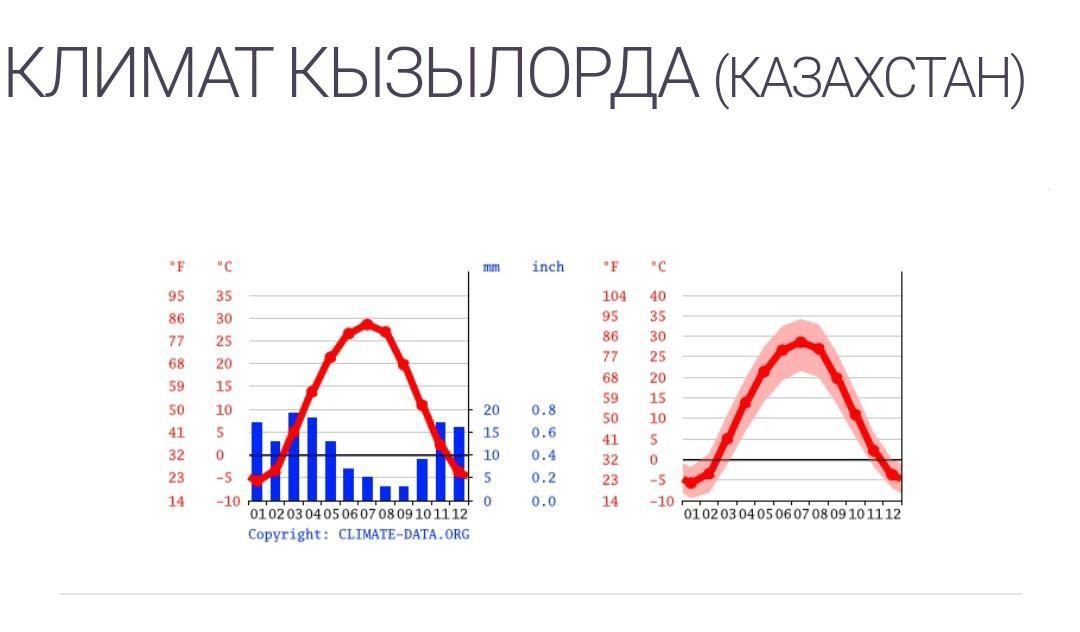 Климат города Кызылорда близок к аридному. В Кызылорда осадков практически нет в течение года. Согласно Кеппен и Гейгера, этот климат классифицируется как BWk. Температура здесь в среднем 11.9 °C. Выпадает около 140 mm осадков в год.