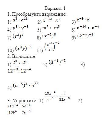1 . 1) a³ * a¹¹ = a¹⁴ ; 2) x⁻¹² * x⁵ = x⁻⁷ ; 3) t⁻⁹ * t = t⁻⁸ ; 4) y⁸ * y⁻⁸ = y⁰= 1 ;