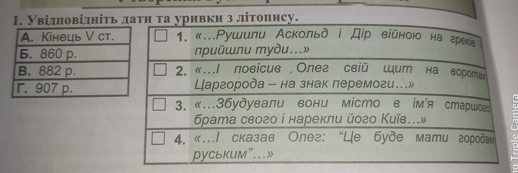 1. Увідповідніть дати та уривки з літопису. А. Кінець V ст. Б. 860 р. B. 882 р. г. 907 р. 1. «...Pушили Аскольд і Дір війною на греків прийшли туди…» воротах 2. свій щит на повісив Олег Царгорода - на знак перемоги...>> в ім'я старшого 3. «...Збудували вони місто брата свого і нарекли його Київ» 4. «.../ сказав Олег: "Це буде мати городам руським”…»