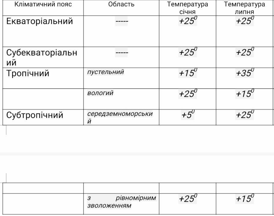 Африка розташована в чотирьох кліматичних поясах – екваторіальному, субекваторіальному, тропічному та субтропічному. В межах тропічного та субтропічного поясів виділяють області пустельного та волого (тропічний пояс), рівномірного зволоження та середземноморського (субтропічний пояс) клімату. Кожен кліматичний пояс має свої температурні особливості, кількість опадів та режим їх випадіння. Розподіл температур від екватора на північ та на південь підтверджують закон широтної зональності).