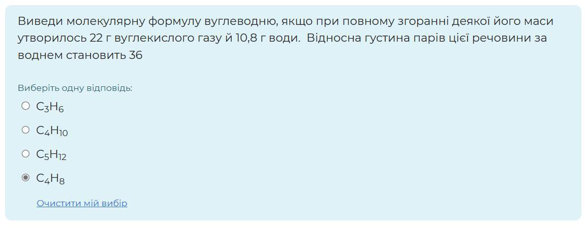 Виведи молекулярну формулу вуглеводню, якщо при повному згоранні деякої його маси утворилось 22 г вуглекислого газу й 10,8 г води. Відносна густина парів цієї речовини за