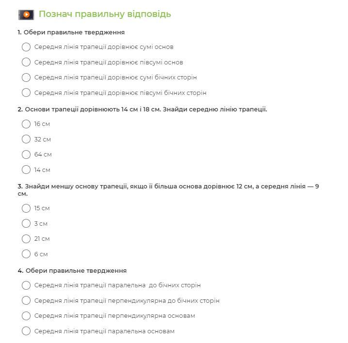 1) Середня лінія трапеції дорівнює півсумі її сторін.