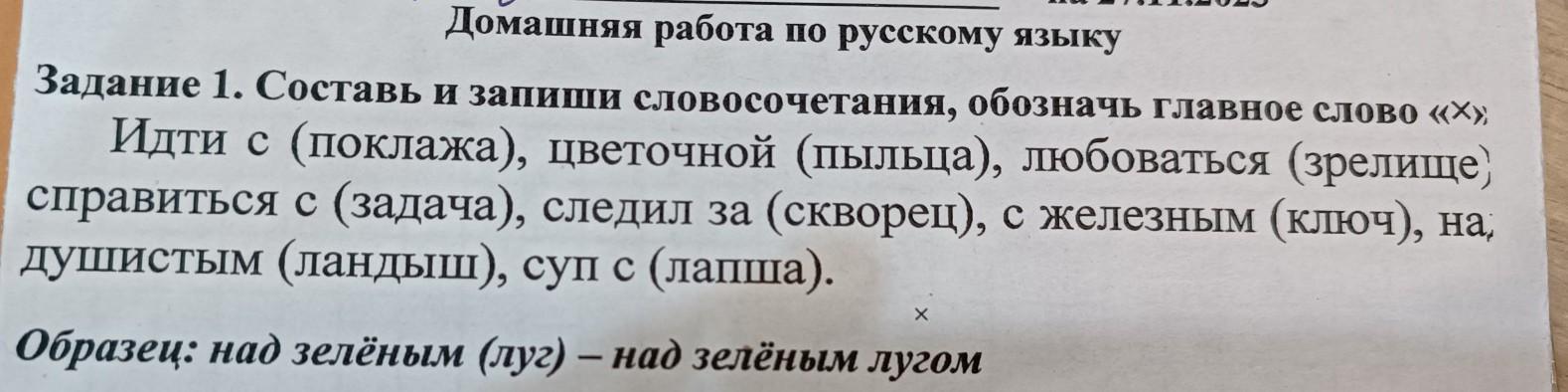 25 БАЛОВВ !!!Домашняя работа по русскому языку Задание 1. Составь и запиши словосочетания, обозначь главное слово > Идти с (поклажа), цветочной (пыльца), любоваться (зрелище) справиться с (задача), следил за (скворец), с железным (ключ), на душистым (ландыш), суп с (лапша). Образец: над зелёным (луг) - над зелёным лугом СМОТРИТЕ ФОТО ПОЛНОСТЬЮ!