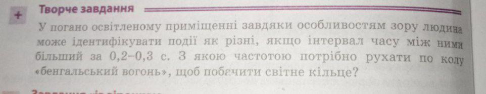 Якщо ми використовуємо середнє значення інтервалу часу, скажімо, 0,25 секунди, то частота буде дорівнювати 1/0,25 = 4 Гц. Це означає, що ви повинні рухати “бенгальський вогонь” чотири рази за секунду, щоб побачити світле кільце.