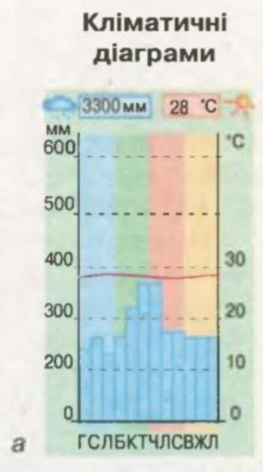 На діаграмі (а) показано екваторіальний клімат. Бо на ній спостерігаємо значну кількість опадів (3300 мм), вони випадають рівномірно протягом року, середньорічна температура дуже висока (+28°).