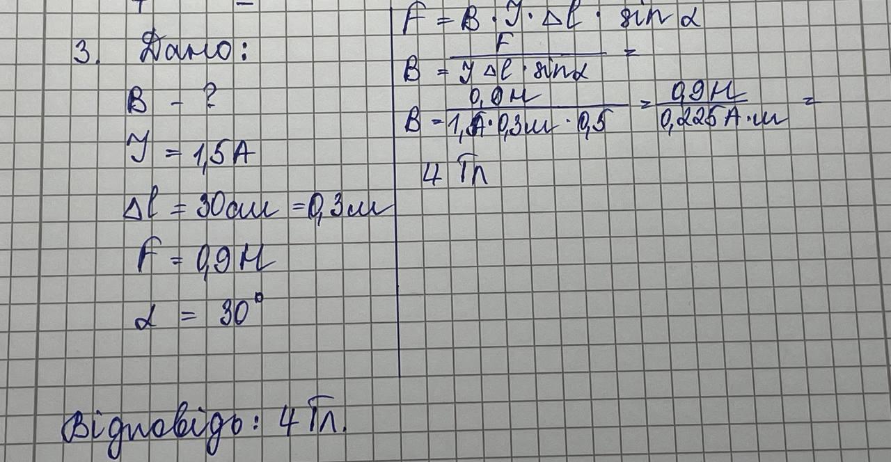1,5 А довжиною 30 см з силою 0,9 Н. Кут між напрямом силових ліній і