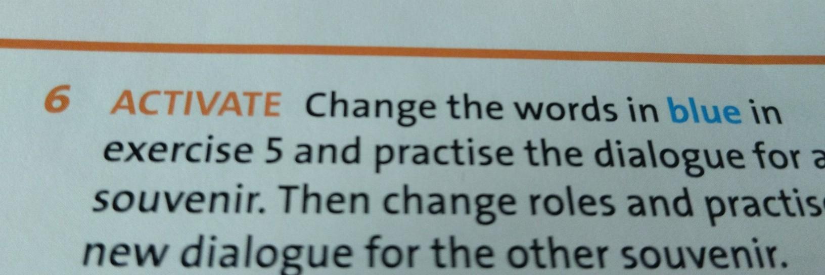 ACTIVATE Change the words in blue in exercise 5 and practise the dialogue for a souvenir. Then change roles and practise a new dialogue for the other souvenir.