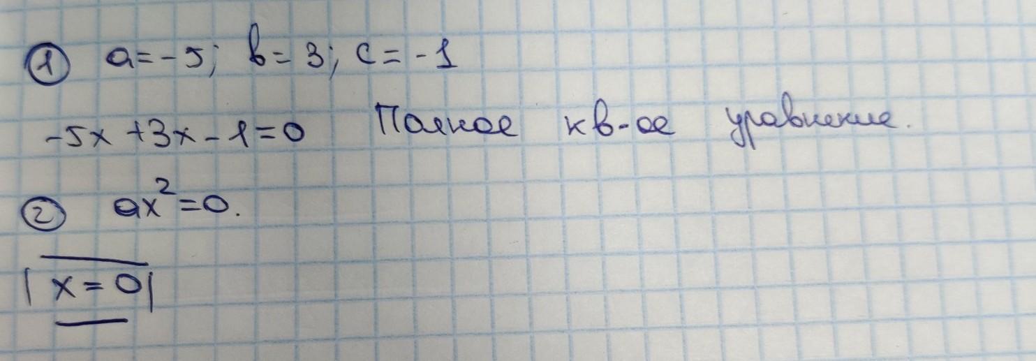 1. а) Запишите квадратное уравнение, если a=-5. b = 3 c = - 1 определите его вид b) Напишите общий вид неполного квадратного уравнения, которое имеет единственный корень.