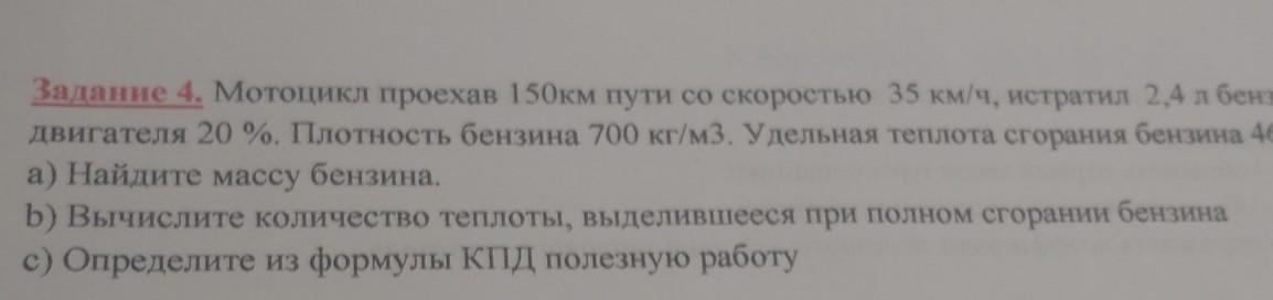 Задание 4. Мотоцикл проехав 150км пути со скоростью 35 км/ч, истратил 2,4 л бензин. А КПД двигателя 20%. Плотность бензина 700 кг/м3. Удельная теплота сгорания бензина 46-106 Дж/кг. а) Найдите массу бензина. b) Вычислите количество теплоты, выделившееся при полном сгорании бензина с) Определите из формулы КПД полезную работу [1] [1]