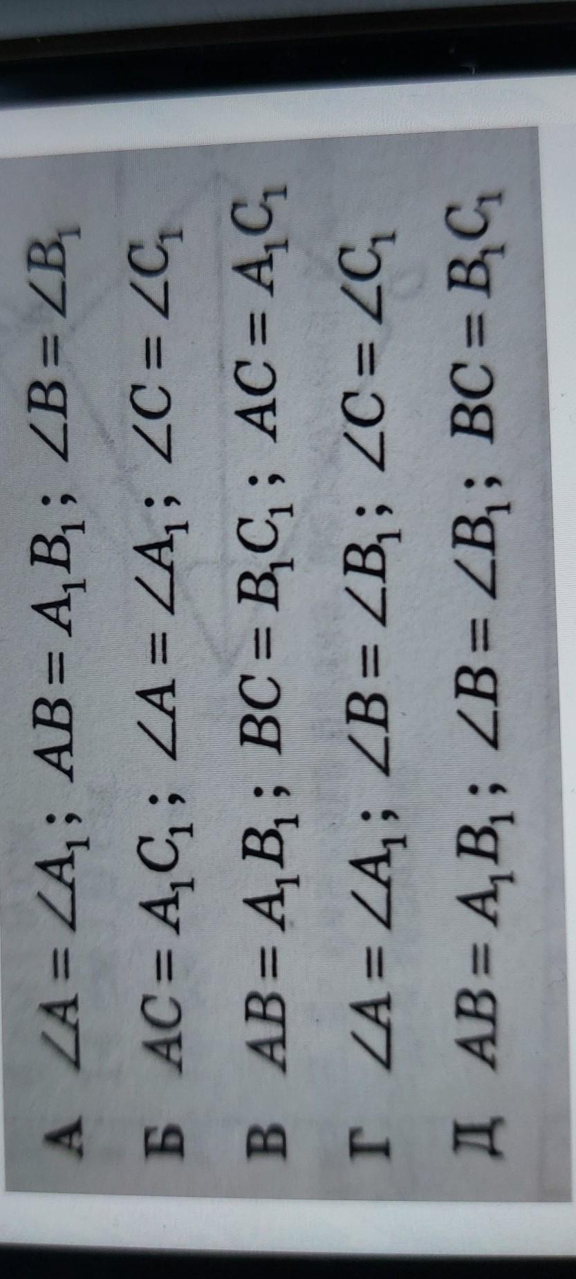 Д) АВ = А1В1; кут В = кут В1; ВС = В1С1.
