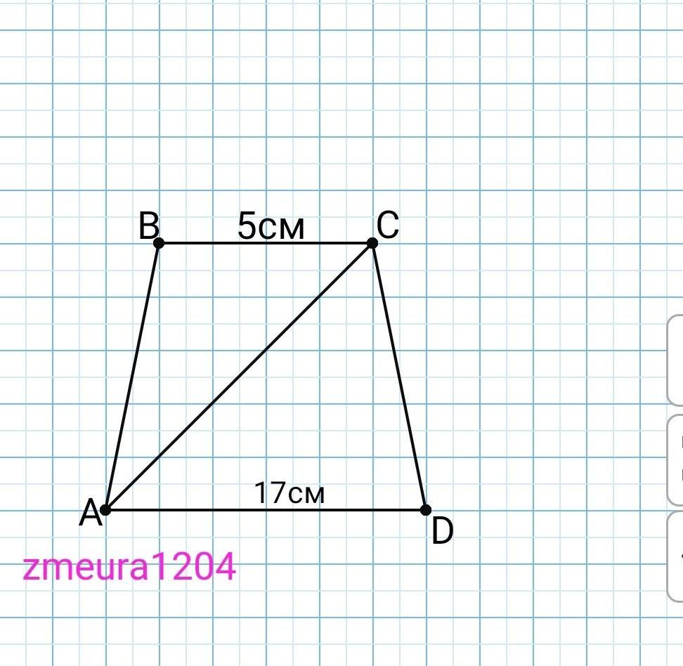 Основания равнобокой трапеции равны 5 см и 17 см, а диагональ делит тупой угол трапеции пополам. Найдите периметр трапеции