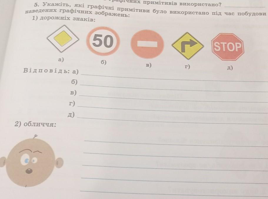 5. Укажіть, які графічні примітиви було використано під час побудови наведених графічних зображень: 1) дорожніх знаків