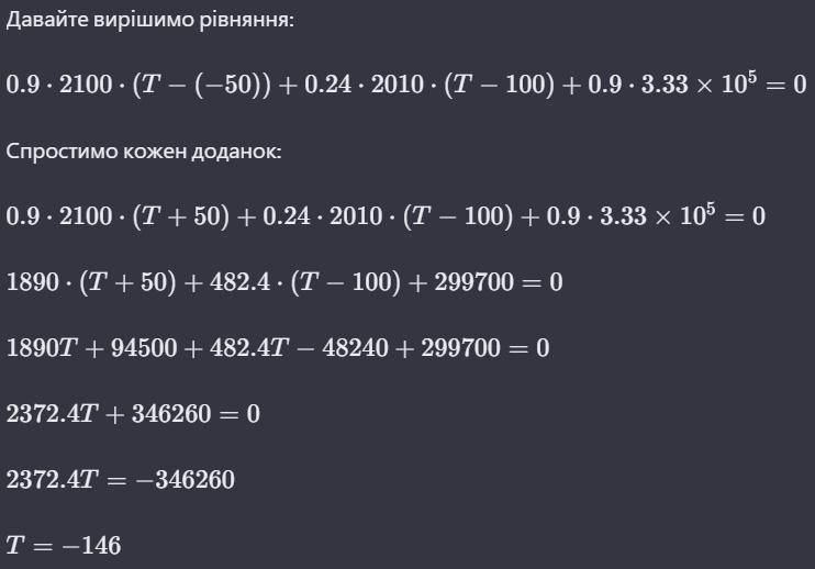 Ответ:Отже, температура рівноваги становить приблизно -146 градусів Цельсія. Це значення від'ємне, що вказує на те, що в системі відбулася зниження температури внаслідок випаровування води та розтавання льоду.