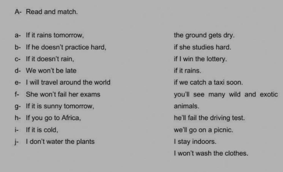 A- Read and match. a- If it rains tomorrow, b- If he doesn't practice hard, c- If it doesn't rain, d- We won't be late e- f- She won't fail her exams I will travel around the world g- If it is sunny tomorrow, h- If you go to Africa, i- If it is cold, j- I don't water the plants the ground gets dry. if she studies hard. if I win the lottery. if it rains. if we catch a taxi soon. you'll see many wild and animals. he'll fail the driving test. we'll go on a picnic. I stay indoors. I won't wash the clothes.