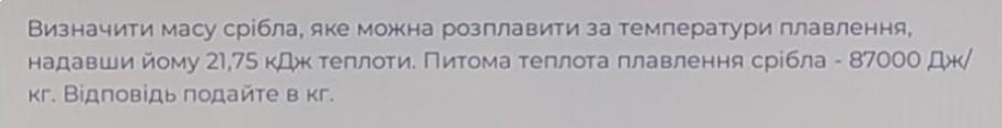 Визначити масу срібла, яке можна розплавити за температури плавлення, надавши йому 21,75 кДж теплоти. Питома теплота плавлення срібла - 87000 Дж/ кг. Вiдповiдь подайте в кг. ПОМОГИТЕ ПОЖАЛУЙСТА ДАЮ 40 БАЛЛОВ