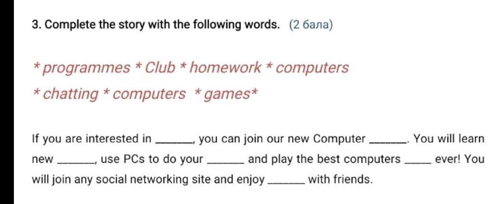 Відповідь:1 computers 2 club 3 programmers 4 homework 5 games 6 chatting