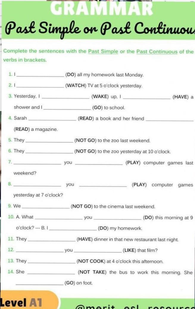 1 did 2 was watching 3 woke up, had , went 4 was reading, was reading 5 didn't go 6 went 7 did you play 8 were you playing 9 didn't go 10 were you doing, was doing 11 had 12 did you like 13 were not cooking 14 didn't take, went