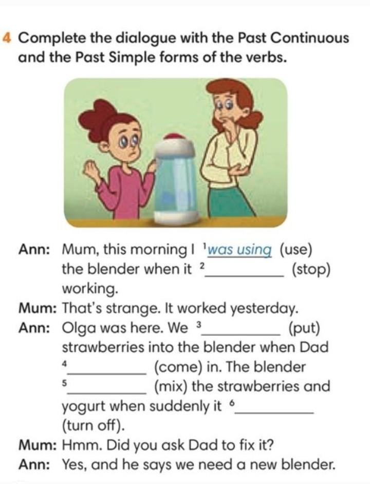 4 Complete the dialogue with the Past Continuous and the Past Simple forms of the verbs. Ann: Mum, this morning I was using (use) the blender when it 2_ (stop) working. Mum: That's strange. It worked yesterday. Ann: Olga was here. We 3 (put) strawberries into the blender when Dad (come) in. The blender (mix) the strawberries and 4 5 yogurt when suddenly it 6 (turn off). Mum: Hmm. Did you ask Dad to fix it? Ann: Yes, and he says we need a new blender.