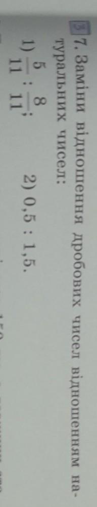 7. Заміни відношення дробових чисел відношенням на- туральних чисел: 5 8 11 : 11 1) 2) 0,5 : 1,5.