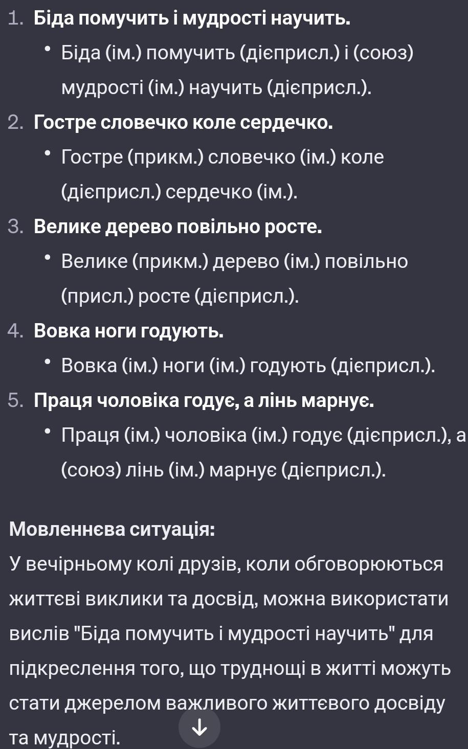 236 1. Спишіть та пiдкресліть члени речення*. Над кожним словом над- пишіть скорочено частину мови. Скористайтеся поданим вище зразком. 1. Біда помучить і мудрості научить. 2. Гостре словечко коле сердечко. 3. Велике дерево повільно росте. 4. Вовка ноги годують. 5. Праця чоловіка годує, а лiнь марнуе.