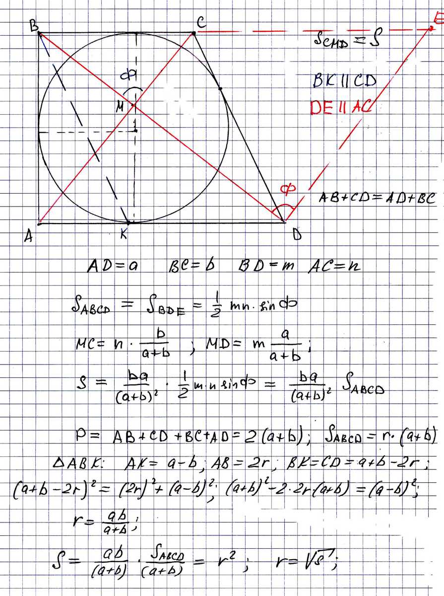 1. Находится связь между прощадью трапеции Sabcd и прощадью треугольника CMD, равной S. Тут можно сделать очень глупую ошибку. Точка М не лежит на диаметре окружности, перпендикулярном основаниям. Поэтому всё, что у нас есть - подобие треугольников МВС и МАD. Ясно, что их стороны пропорциональны основаниям.