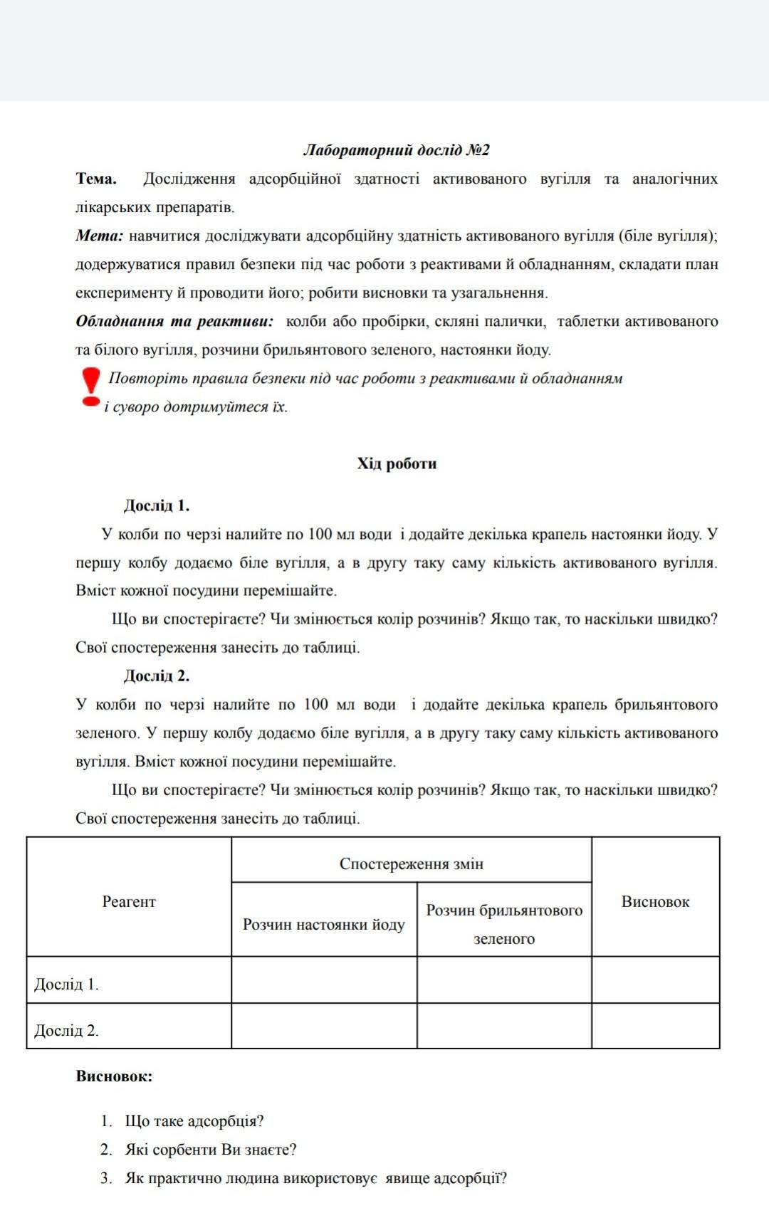 1. Під час досліду відбувається адсорбція метиленового синього на поверхні активованого вугілля та білої глини. Активоване вугілля виявилося ефективнішим сорбентом, ніж біла глина.