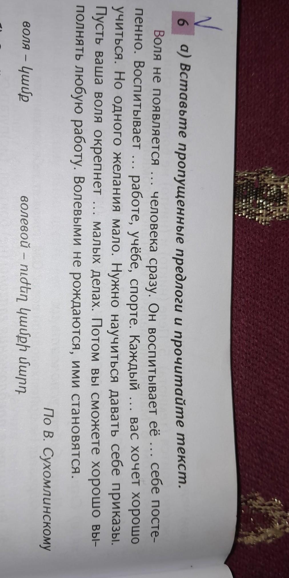 Воля не появляется ... человека сразу. Он воспитывает её ... себе посте- пенно. Воспитывает работе, учëбе, спорте. Каждый ... вас хочет хорошо учиться. Но одного желания мало. Нужно научиться давать себе приказы. Пусть ваша воля окрепнет ... малых делах. Потом вы сможете хорошо вы полнять любую работу. Волевыми не рождаются, ими становятся.