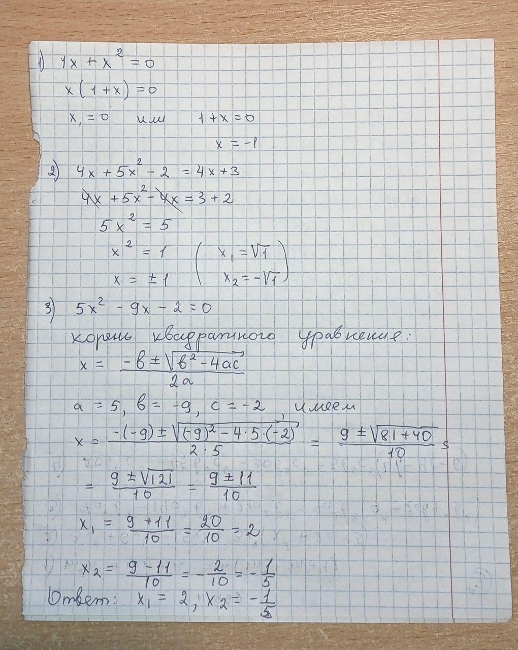 a) 1x+x^2=0 b) 4x + 5x^2-2=4x+3 c)5x^2-9x-2=0