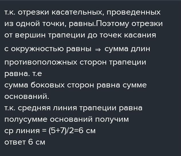 7. Знайдіть середню лінію трапеції, описаної навколо кола, якщо її бічні сторони дорівнюють 9 см і 11 см.