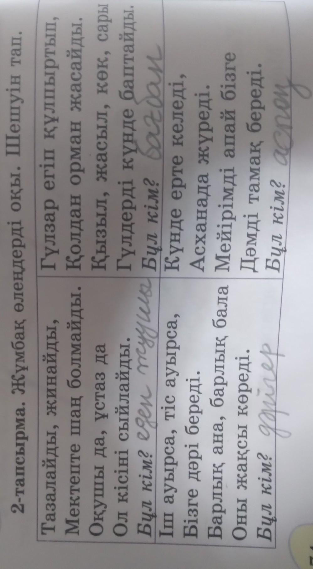 2-тапсырма. Жұмбак өлеңдерді оқы. Шешуін тап. Тазалайды, жинайды, Мектепте шаң болмайды. Оқушы да, ұстаз да Ол кісіні сыйлайды. Бұл кім? Іш ауырса, тіс ауырса, Гүлзар егіп құлпыртып, Колдан орман жасайды. Қызыл, жасыл, көк, сары Гүлдерді күнде баптайды. Бұл кім? Күнде ерте келеді, Асханада жүреді. Мейірімді апай бізге Бізге дәрі береді. Барлық ана, барлық бала Оны жақсы көреді. Бұл кім? Дәмді тамақ береді. Бұл кім?
