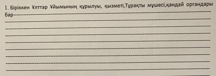 біріккен ұлттар ұиымы 1945 жыло яғни екінші дүниежізілік соғыс тан кейін құрылған партия ол сан Франциско қаласында құрылған оның негізгі қызметі мүше мемлекеттерді қорғау барлық проблеманы бейбіт жолмен шешу күш қолданбау және т. Б қазіргі кезде оған 195 мемелекет мүше оның органы бас оссамблея мен қауіпсіздік жайлы органы бар