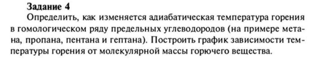 По этим данным можно построить график зависимости адиабатической температуры горения от молекулярной массы углеводорода. Молекулярные массы метана, пропана, пентана и гептана составляют соответственно 16, 44, 72 и 100 г/моль.