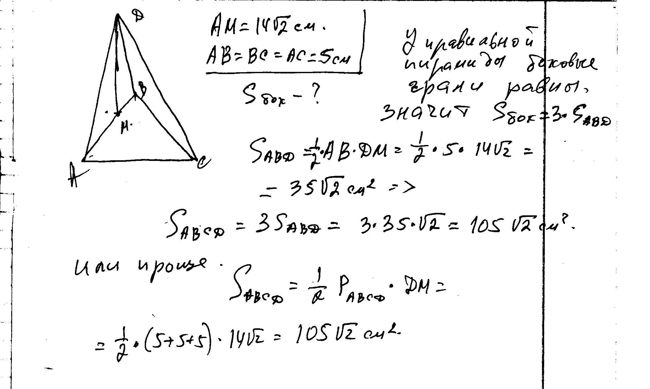 стороны основания правильной треугольной пирамиды равны 5 см, апофема - 14 корней из 2 см. найдите площадь боковой поверхности пирамиды