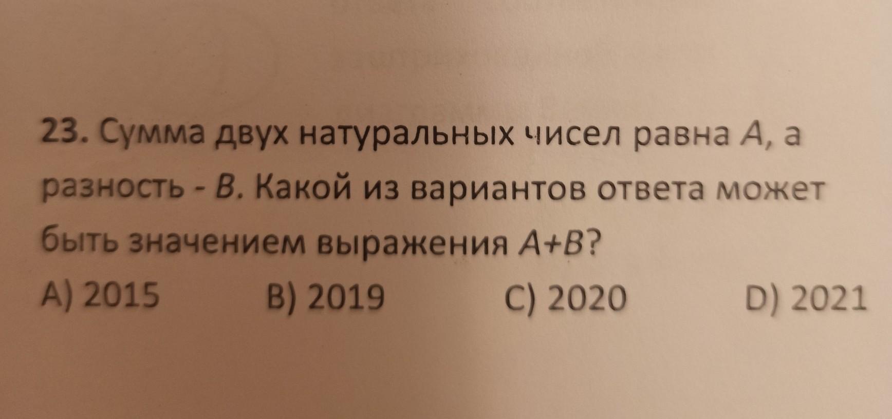 Для того, щоб варіант відповіді міг бути значенням виразу \( A + B \), він повинен бути кратним 2. Спробуймо обрати правильну відповідь: