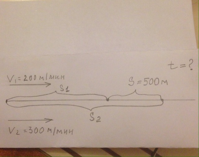 два велосипедиста выехали из пункта А. Первый двигался со скоростью 200 м/мин и проехал S1 пути, а второй за это же время, двигаясь со скоростью 300 м/мин проехал на 500 м больше. Сколько времени было затрачено?