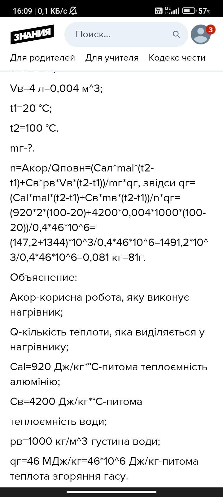 4. На нагрівнику із ККД 40% в алюмінієвій каструлі масою 2 кг необхідно довести до кипіння 4 л води, що має температуру 20°С. Визначте витрати гасу на нагрівання води й каструлі.