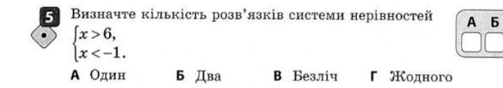 Визначте кількість розв'язків системи нерівностей x > 6 ,\\ x<-1.