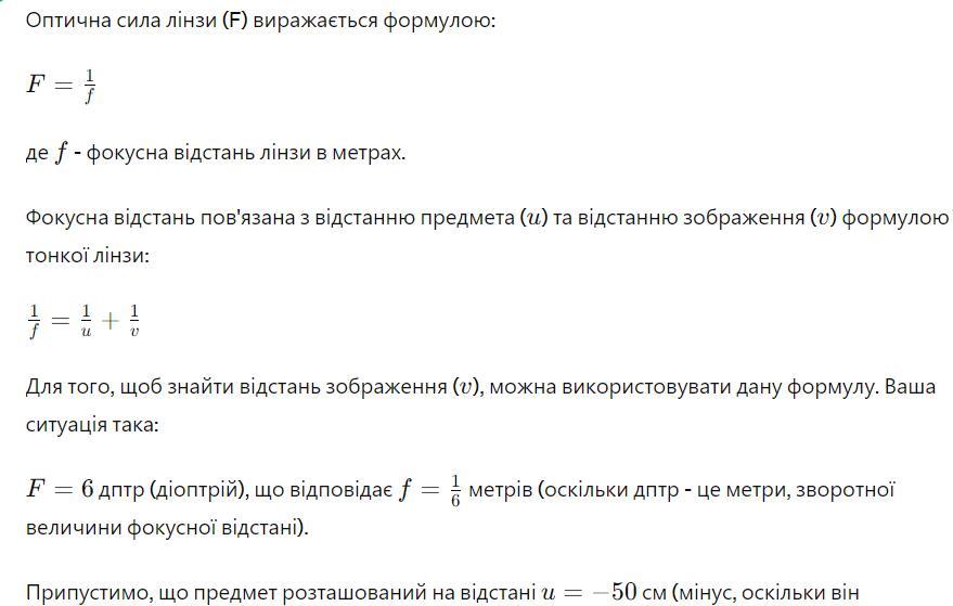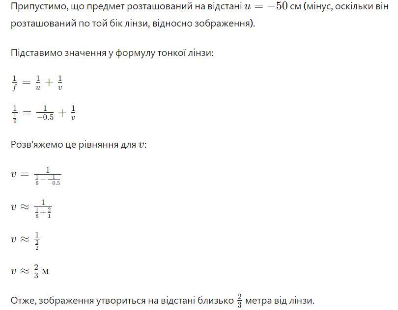 Предмет розташований на відстані 50 см від тонкої лінзи. На якій відстані утвориться зображення предмета, якщо оптична сила лінзи 6 дптр. ДОПОМОЖІТЬ