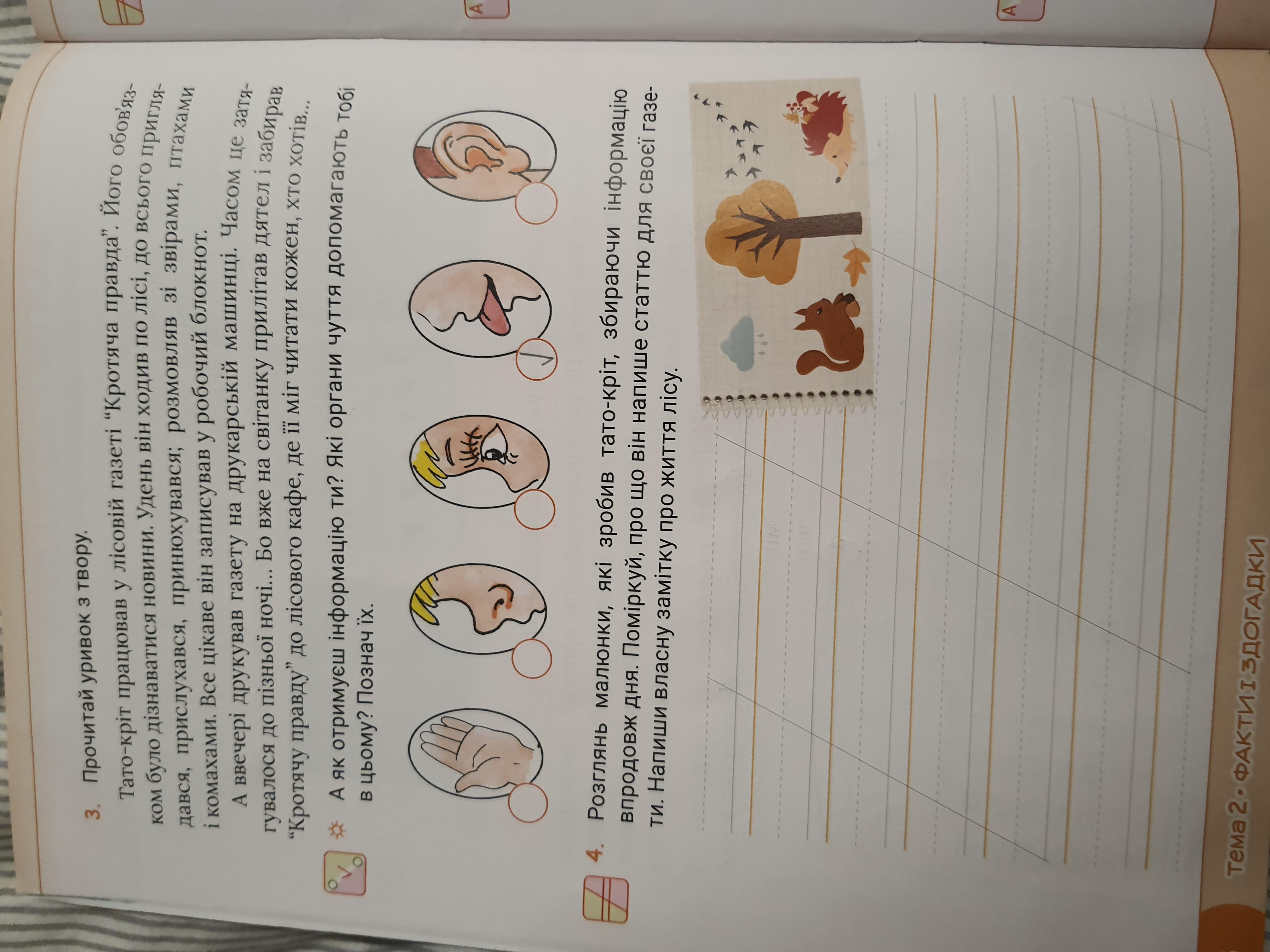4.Розглянь малюнки,які зробив тато кріт,збираючи інформацію впродовж дня.Поміркуй,про що він напише статтю для своєї газети.Напиши власну замітку про життя лісу. 4.Я вважаю, що віннапишу про природу. Так?