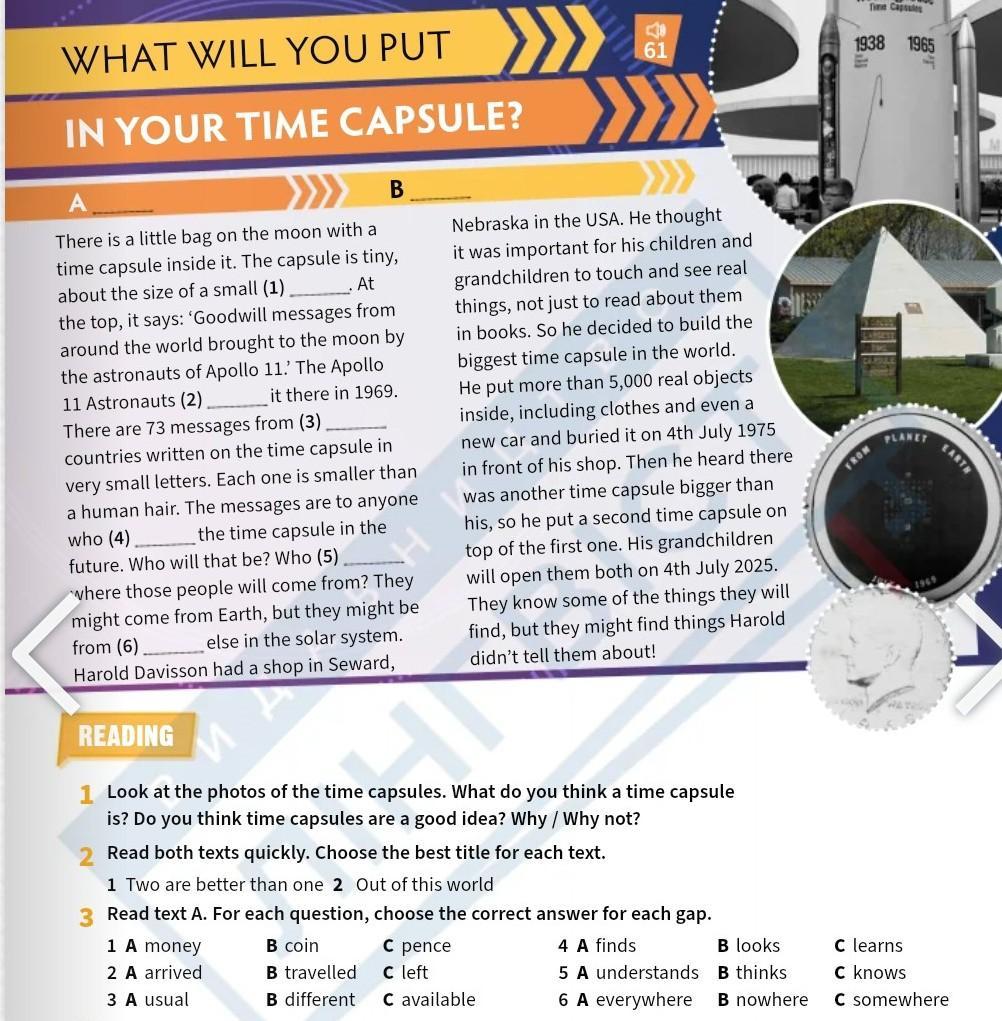 B There is a little bag on the moon with a time capsule inside it. The capsule is tiny, At about the size of a small (1) the top, it says: 'Goodwill messages from around the world brought to the moon by the astronauts of Apollo 11.' The Apollo it there in 1969. 11 Astronauts (2) There are 73 messages from (3), countries written on the time capsule in very small letters. Each one is smaller than a human hair. The messages are to anyone who (4) the time capsule in the future. Who will that be? Who (5) where those people will come from? They might come from Earth, but they might be from (6) else in the solar system. Harold Davisson had a shop in Seward, Nebraska in the USA. He thought it was important for his children and grandchildren to touch and see real things, not just to read about them in books. So he decided to build the biggest time capsule in the world. He put more than 5,000 real objects inside, including clothes and even a new car and buried it on 4th July 1975 in front of his shop. Then he heard there was another time capsule bigger than his, so he put a second time capsule on top of the first one. His grandchildren will open them both on 4th July 2025. They know some of the things they will find, but they might find things Harold didn't tell them about! FROM PLANET EARY