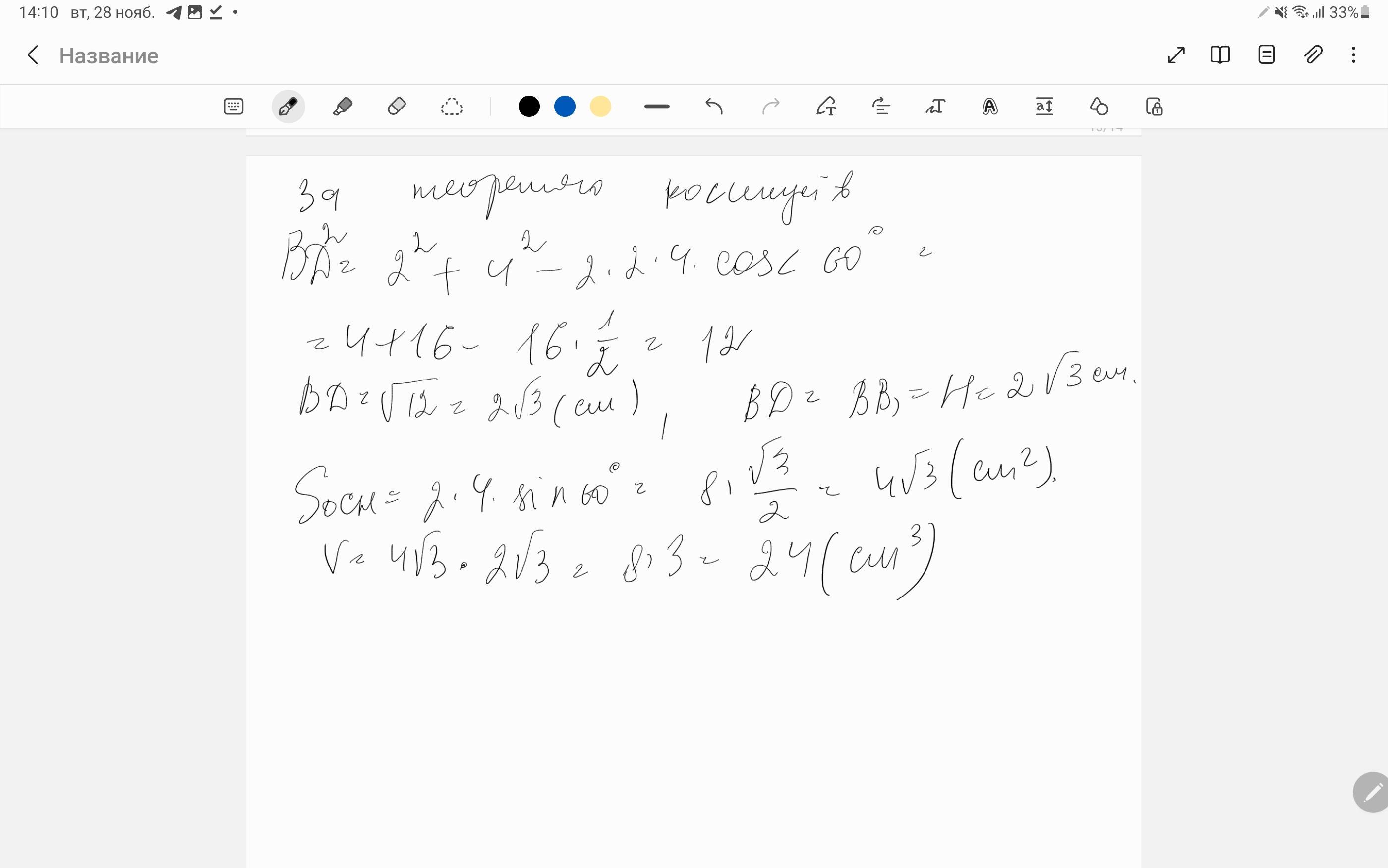 площини основи під кутом 45°. Знайдіть об’єм паралелепіпеда.