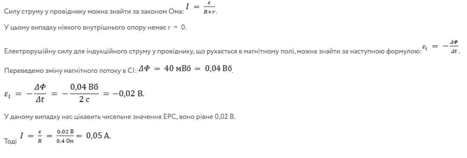 Магнітний потік через контур замкненого провідника опором 0,4 Ом за дві секунди змінюється на 40 мВ6. Яка сила струму проходить у провіднику під час цієї зміни, якщо магнітний потік змінюється рівномірно?