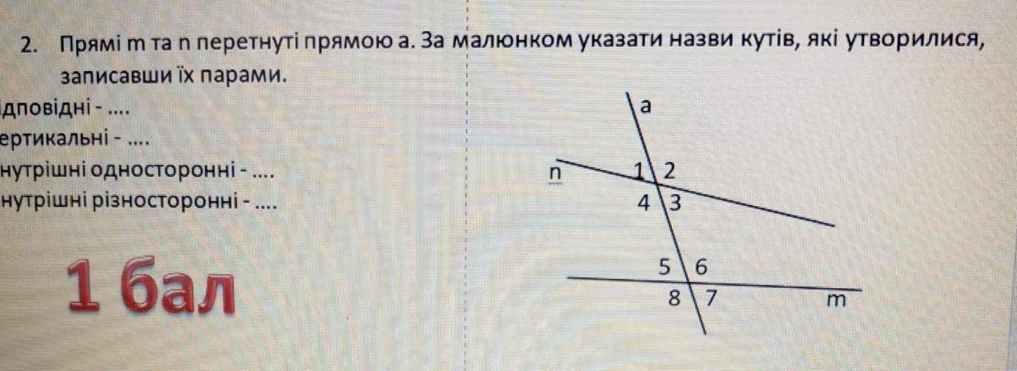 2. Прямi м та п перетнуті прямою а. За малюнком указати назви кутів, які утворилися, записавши їх парами. Вiдповiднi ...... Вертикальнi - Внутрішні односторонні ....... Внутрішні різносторонні пожалуйста Срочно! отмечу лучшим ответом