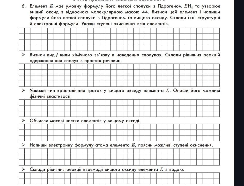 6. Елемент Е має умовну формулу його леткої сполуки з Гідрогеном ЕНа та утворює вищий оксид з відносною молекулярною масою 44. Визнач цей елемент і напиши формули його леткої сполуки з Гідрогеном та вищого оксиду. Склади їхні структурні й електронні формули. Укажи ступені окиснення всіх елементів. Визнач вид / види хiмiчного зв'язку в наведених сполуках. Склади рiвняння реакцій одержання цих сполук з простих речовин. Уакажи тип кристалічних ґраток у вищого оксиду елемента Е. Опиши його можливі фізичні властивості. > Обчисли масові частки елементів у вищому оксидi. ► Напиши електронну формулу атома елемента Е, поясни можливі ступені окиснення. > Склади рiвняння реакції взаємодії вищого оксиду елемента Е з водою. ТТ