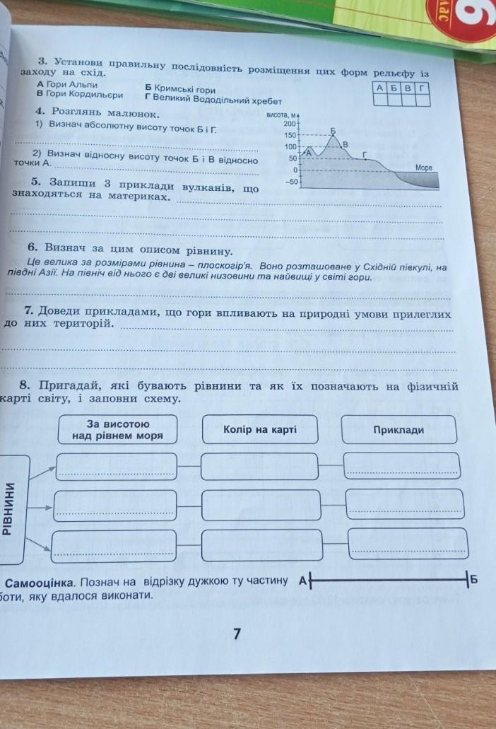 3. Установи правильну послідовність розміщення цих форм рельефу із заходу на схід. А Б В Г А Гори Альпи В Гори Кордильери Б Кримські гори Г Великий Вододiльний хребет 4. Розглянь малюнок. 1) Визнач абсолютну висоту точок Б i Г. 2) Визнач відносну висоту точок Б і в відносно точки А. 5. Запиши 3 приклади вулканів, що знаходяться на материках. висота, м 200 За висотою над рівнем моря 150- 100 50- 0 -50- 6. Визнач за цим описом рівнину. Це велика за розмірами рiвнина - плоскогір'я. Воно розташоване у Східній півкулі, на iвднi Азії. На північ від нього є дві великі низовини та найвищі у світі гори. 7 7. Доведи прикладами, що гори впливають на природні умови прилеглих о них територій. ада 8. Пригадай, які бувають рiвнини та як їх позначають на фізичній арті світу, і заповни схему. Колір на карті Mope Самооцінка. Познач на відрізку дужкою ту частину А ти, яку вдалося виконати. Приклади EXI -Б
