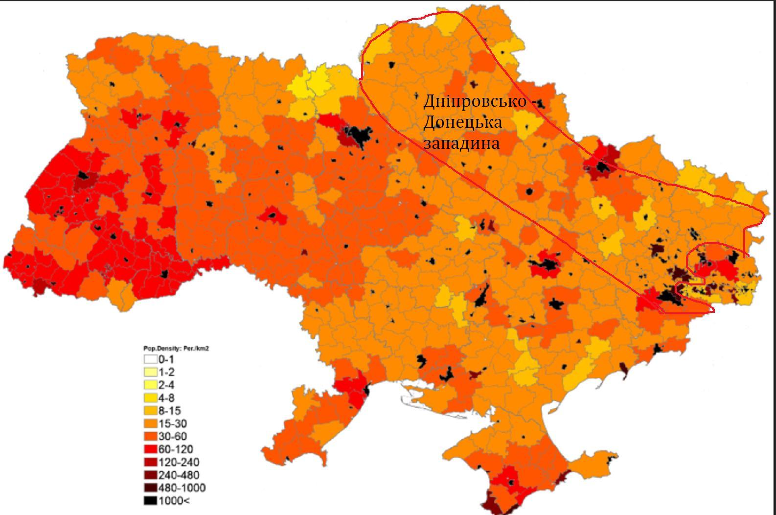 Як видно з карти щільності населення України, яка дана нижче у додатку, густота населення Дніпровсько - Донецької западини буде порядку 30 - 60 осіб/км².